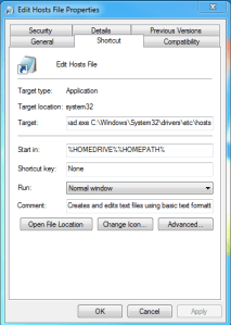 - Update the Target property to “%windir%\system32\notepad.exe C:\Windows\System32\drivers\etc\hosts”