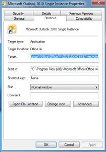 If you open the properties of the “Microsoft Outlook 2010” shortcut in Windows 7, you will find that the target value is greyed out with the value of “Microsoft Office Professional Plus 2010” or whatever version you have installed.