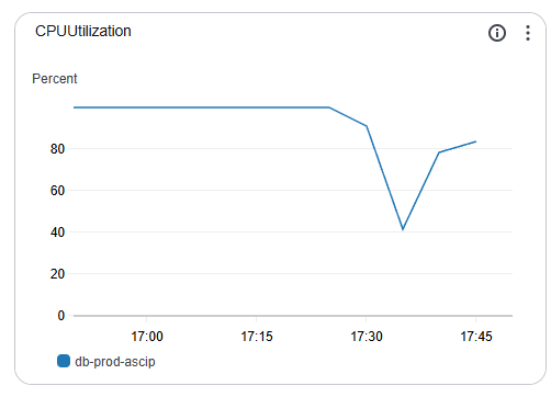 An alert indicated that the server was nearing its CPU capacity. To start our investigation, we examine the instance’s Monitoring tab and see that the “CPUUtilization” metric indeed indicates an issue. This chart shows a server restart around the 17:35 mark to free up some resources. However, it quickly rockets back up.