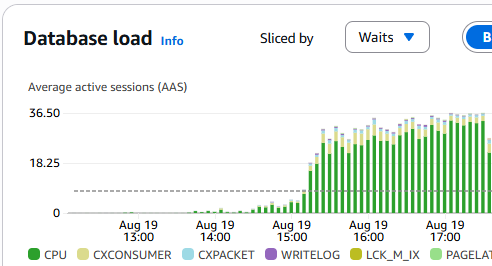 Next, we examine our Database Insights (which you will need to activate in advance). Here we see CPU waits exceeding our max vCPU threshold, indicating an issue.